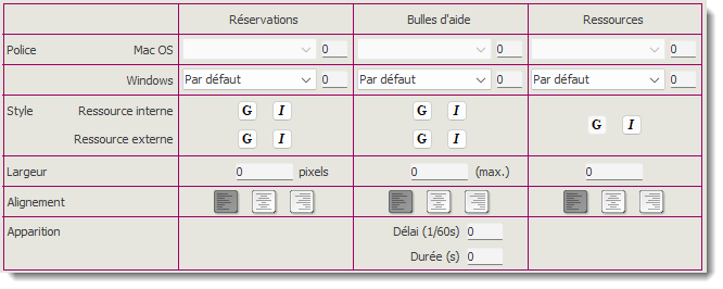 Cette partie permet de régler le contenu des réservations affichées dans le planning pour tous les types de ressources (Salle, Matériel, Personnel), le contenu des bulles d’aide affichées en cas de