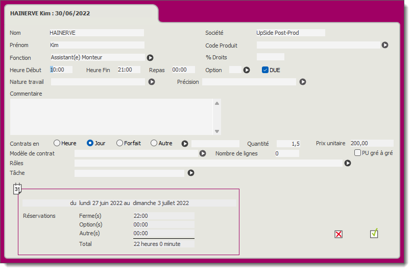 Chargé de Production (CP) : ce champ est renseigné par le choix de l’affaire mais peut être modifié pour la ou les réservations en cours de saisie grâce au PopUp disponible.